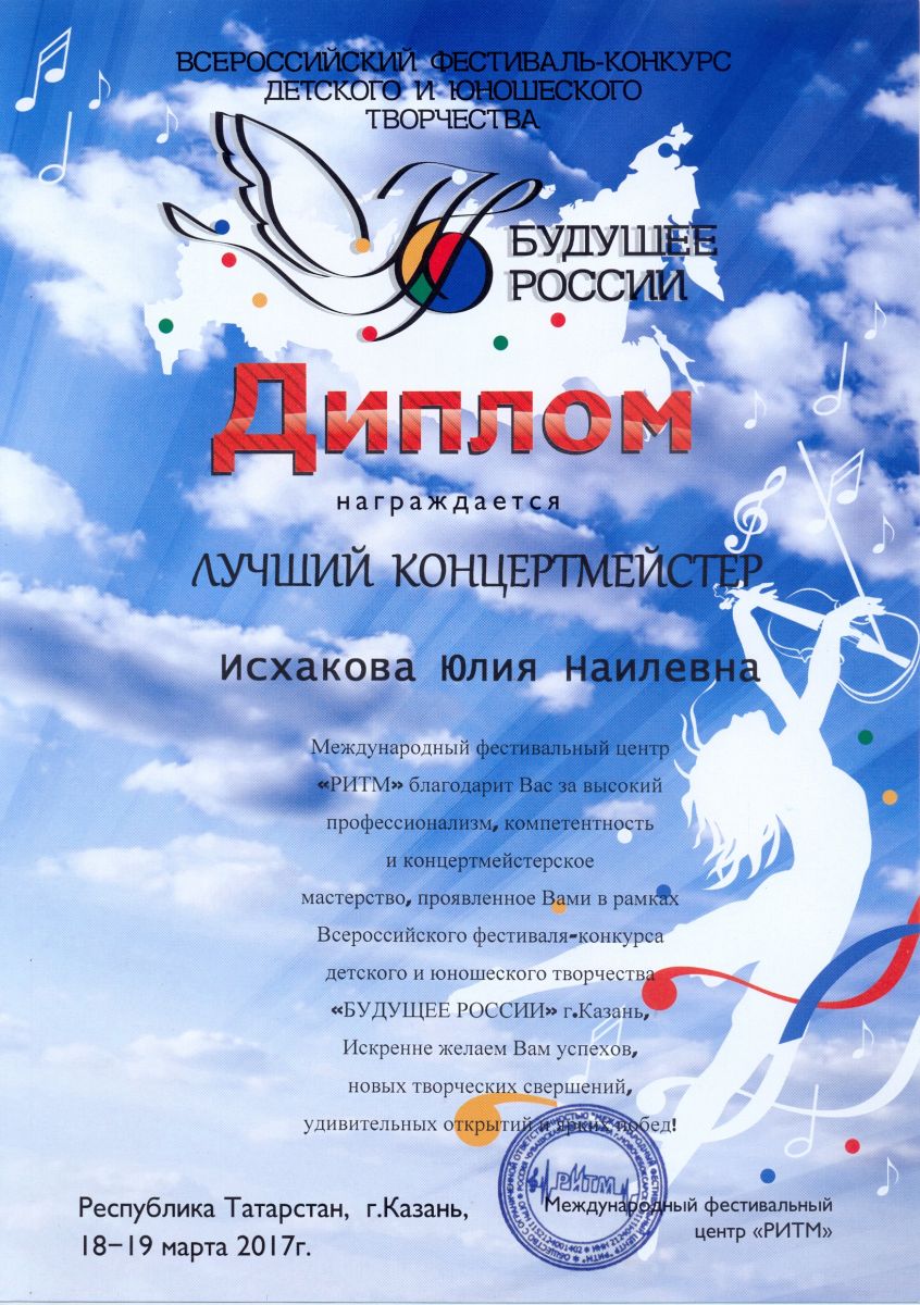 Всероссийский фестиваль-конкурс детского и юношеского творчества "Будущее России" - Исхакова Ю.Н. - диплом лучшего концертмейстера
