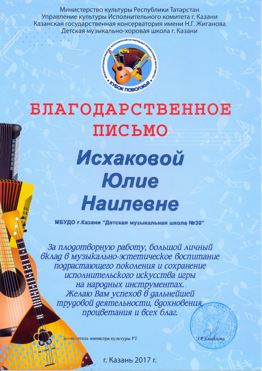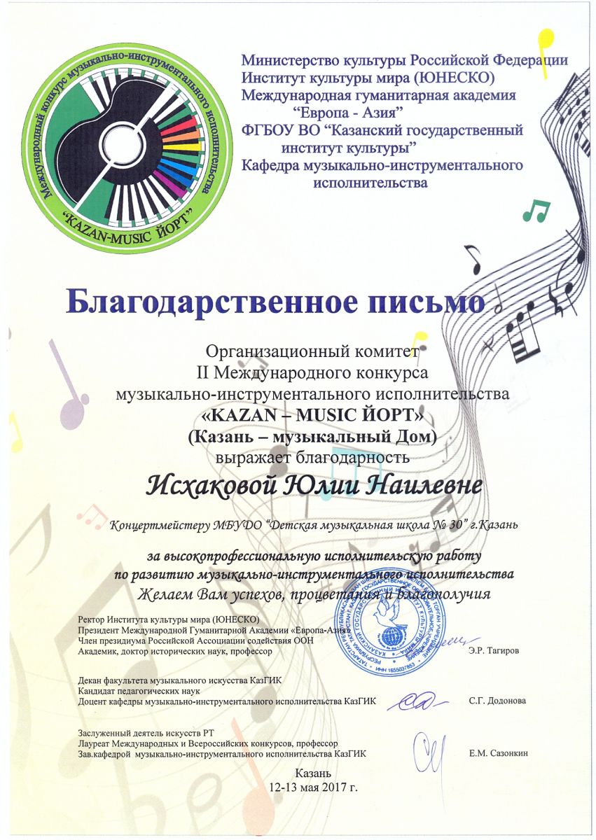 II Международный конкурс музыкально-инструментального исполнительства "KAZAN - MUSIC ЙОРТ" - Исхакова Ю.Н. - благодарственное письмо