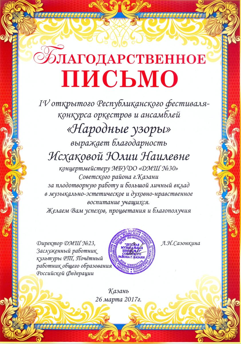 IV Открытый Республиканский фестиваль-конкурс оркестров и ансамблей "Народные узоры" - Исхакова Ю.Н. - благодарственное письмо за личный вклад в воспитание учащихся