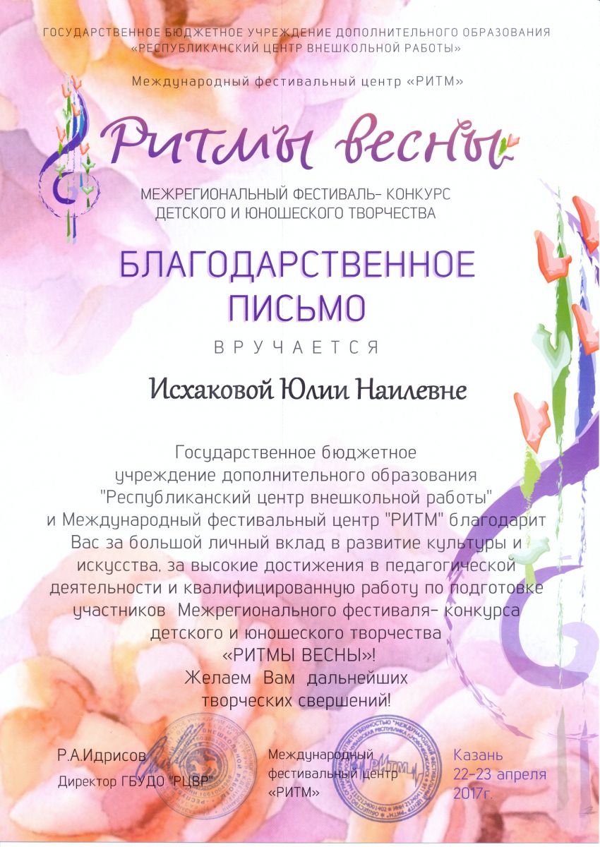 Межрегиональный фестиваль-конкурс детского и юношеского творчества "Ритмы весны" - Исхакова Ю.Н. - благодарственное письмо