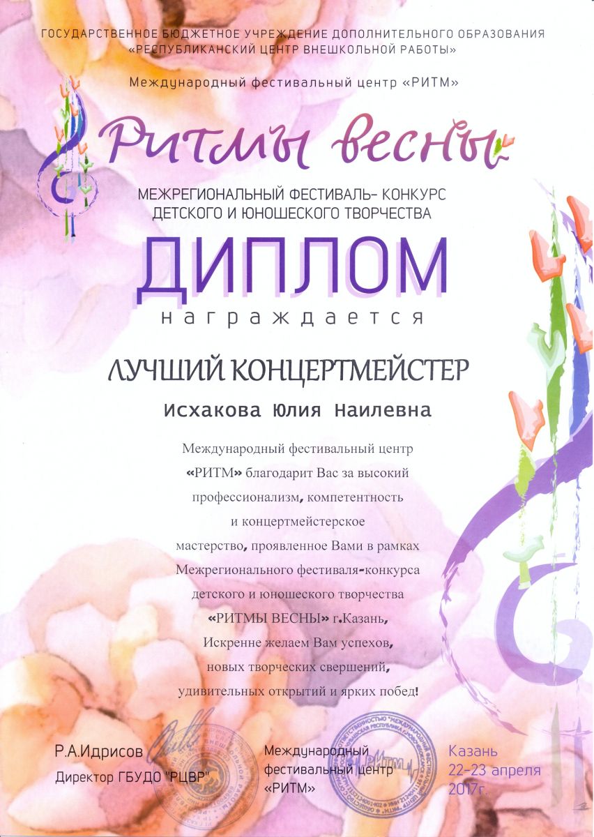 Межрегиональный фестиваль-конкурс детского и юношеского творчества "Ритмы весны" - Исхакова Ю.Н. - диплом лучшего концертмейстера