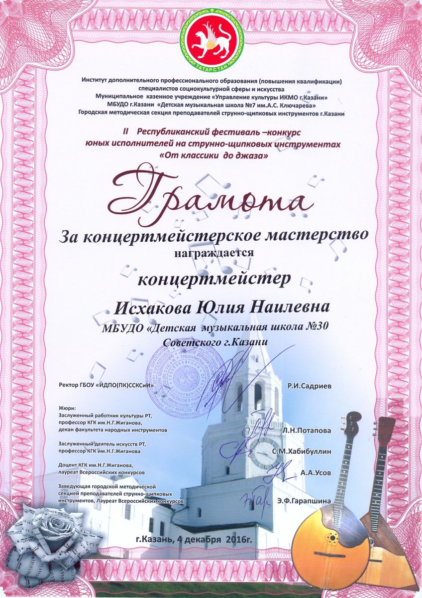 II Республиканский фестиваль-конкурс юных исполнителей на струнно-щипковых инструментах "От классики до джаза" - Исхакова Ю.Н. - грамота за концертмейстерское мастерство