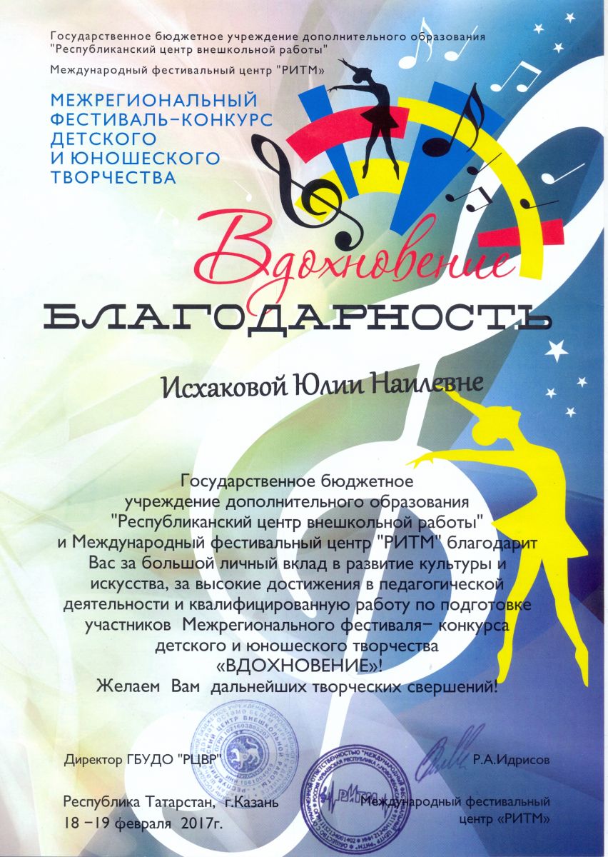 Межрегиональный фестиваль-конкурс детского и юношеского творчества "Вдохновение" - Исхакова Ю.Н. - благодарственное письмо за высокие достижения в педагогической деятельности