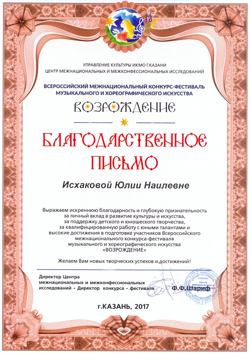 Всероссийский межнациональный конкурс-фестиваль музыкального и хореографического искусства "Возрождение" - Исхакова Ю.Н. - благодарственное письмо за личный вклад в развитие культуры и искусства