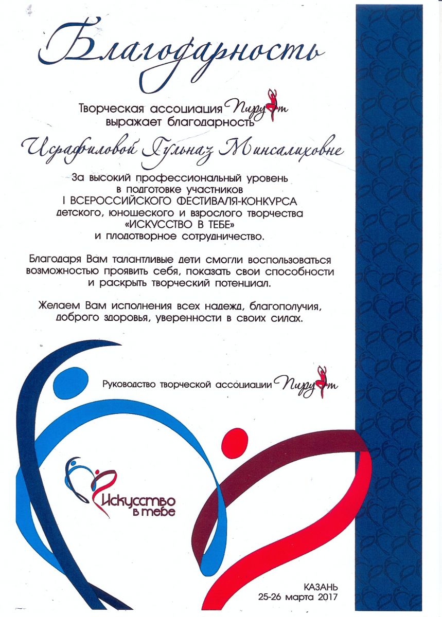 I Всероссийский фестиваль-конкурс детского, юношеского и взрослого творчества "Искусство в тебе" - Исрафилова Г.М. - благодарность за высокий профессиональный уровень