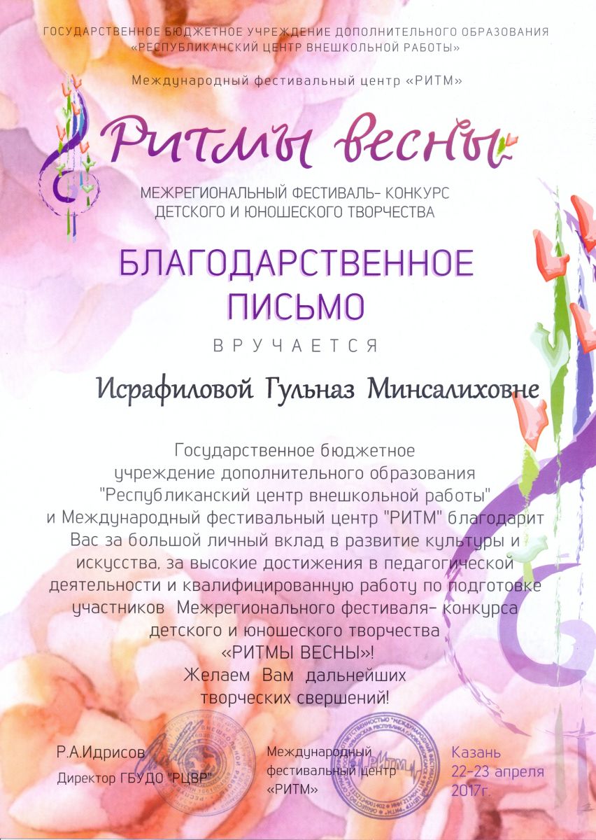 Межрегиональный фествиаль-конкурс детского и юношеского творчества "Ритмы весны" - Исрафилова Г.М. - благодарственное письмо