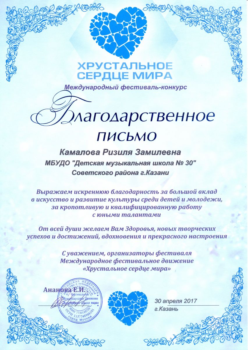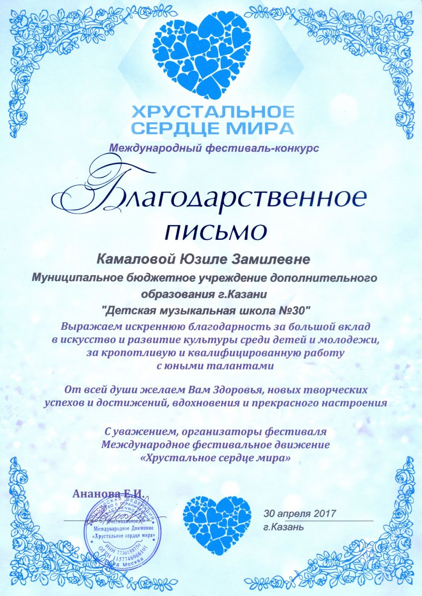 Международный фестиваль-конкурс "Хрустальное сердце мира" - Камалова Ю.З. - благодарственное письмо за большой вклад в искусство и развитие культуры среди детей и молодежи