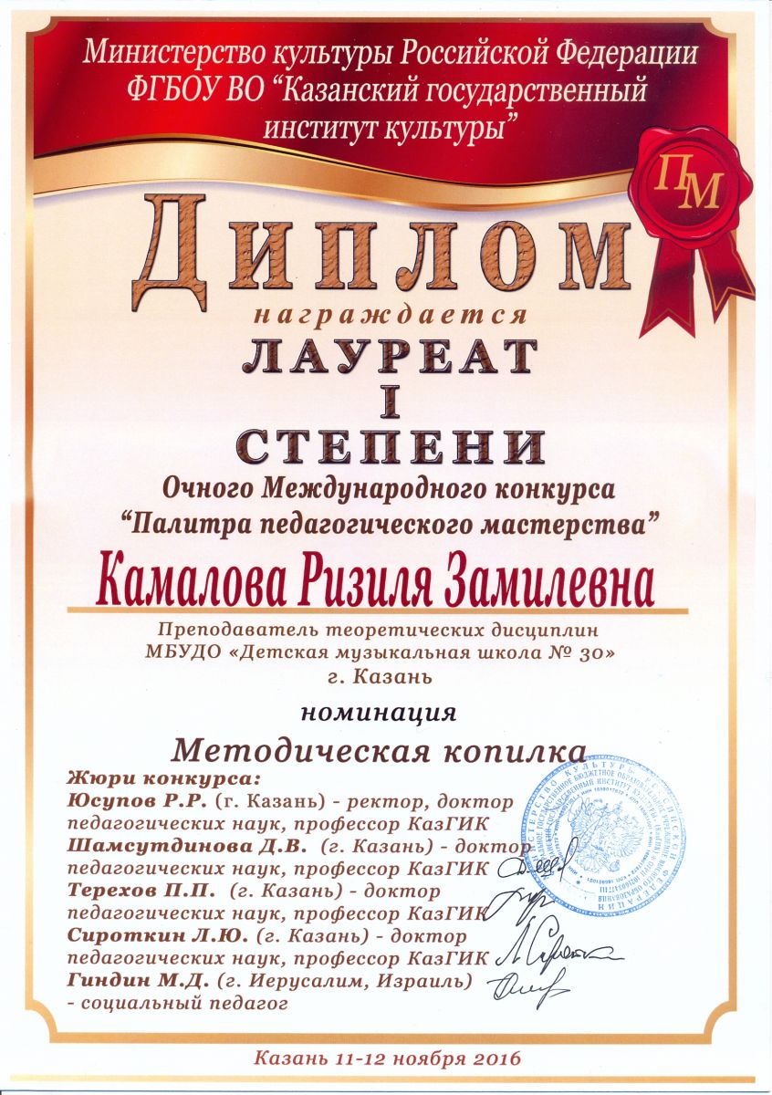 Очный этап Международного конкурса "Палитра педагогического мастерства: методические разработки" - Камалова Р.З. - I место в номинации "Методическая копилка"