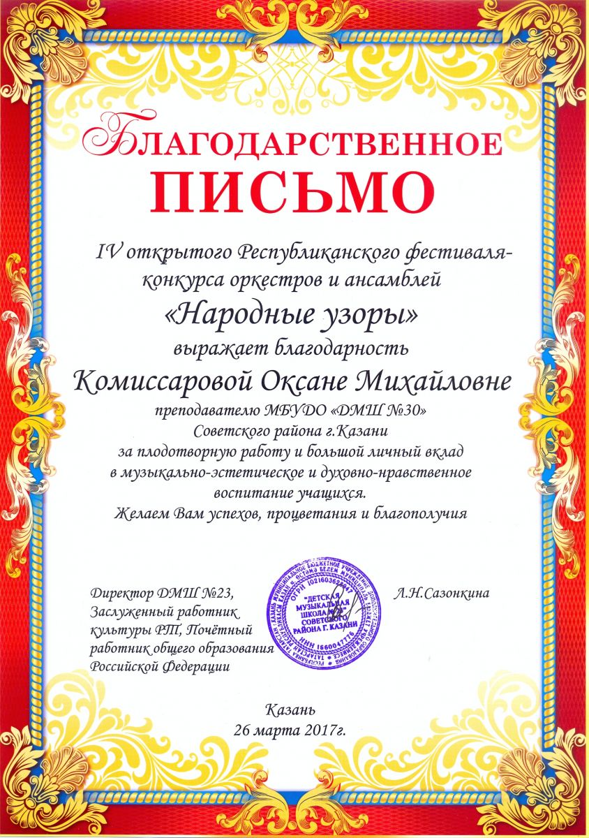 IV Открытый Республиканский фестиваль-конкурс оркестров и ансамблей "Народные узоры" - Комиссарова О.М. - благодарственное письмо за личный вклад в воспитание учащихся