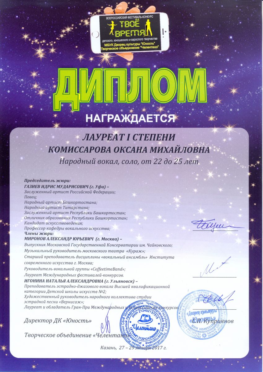 Всероссийский фестиваль-конкурс детского, юношеского и взрослого творчества "Твое время" - Комиссарова О.М. - I место