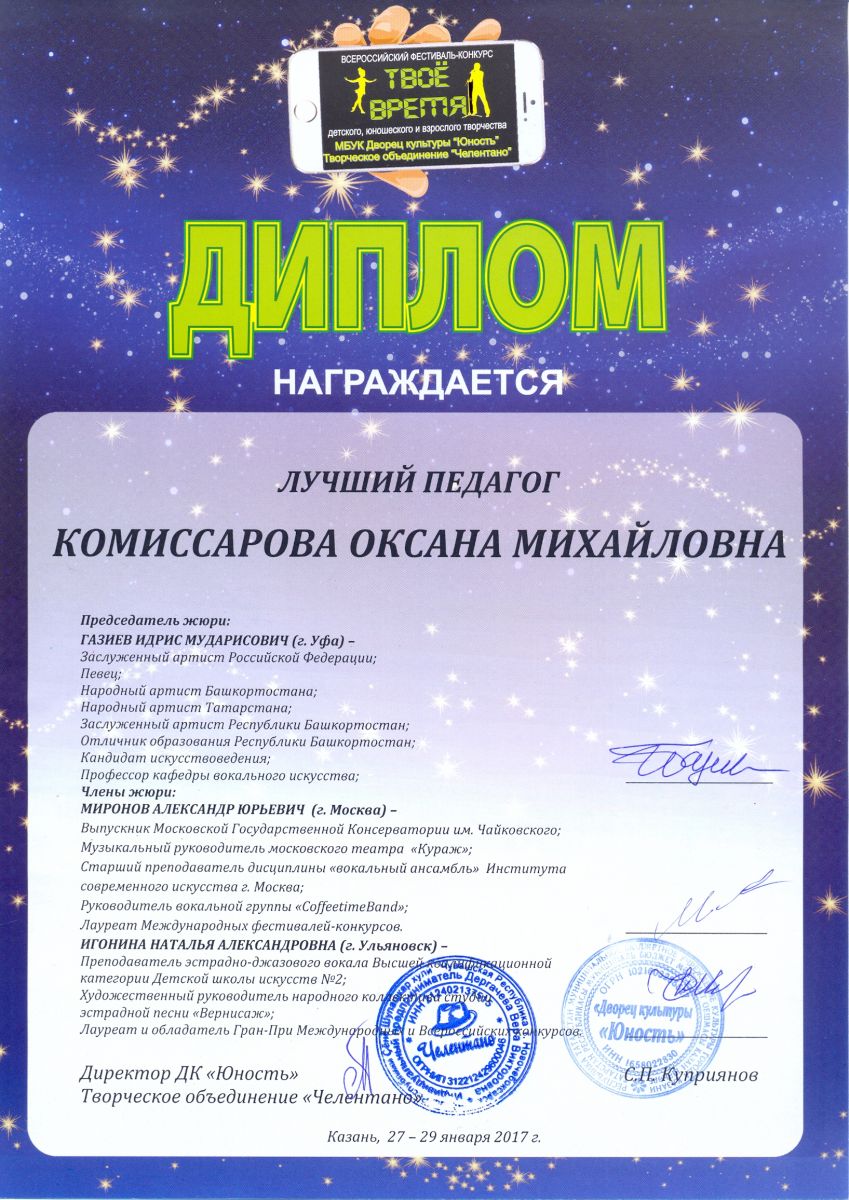 Всероссийский фестиваль-конкурс детского, юношеского и взрослого творчества "Твое время" - Комиссарова О.М. - диплом лучшего педагога