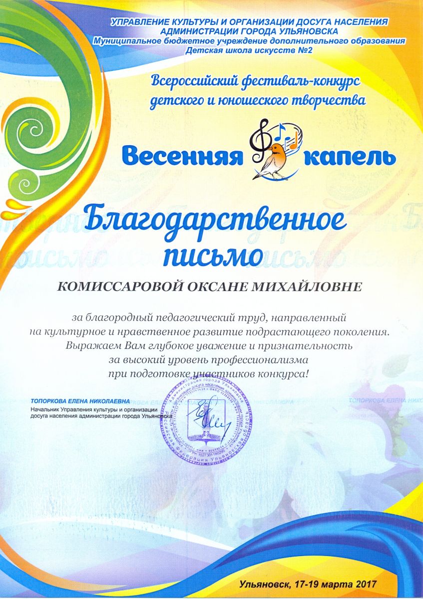 Всероссийский фестиваль-конкурс детского и юношеского творчества "Весеняя капель" - Комиссарова О.М. - благодарственное письмо за высокий профессиональный уровень подготовки участников конкурса