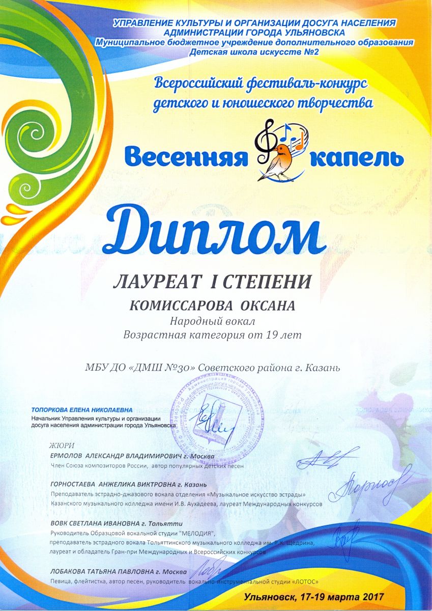 Всероссийский фестиваль-конкурс детского и юношеского творчества "Весеняя капель" - Комиссарова О.М. - I место