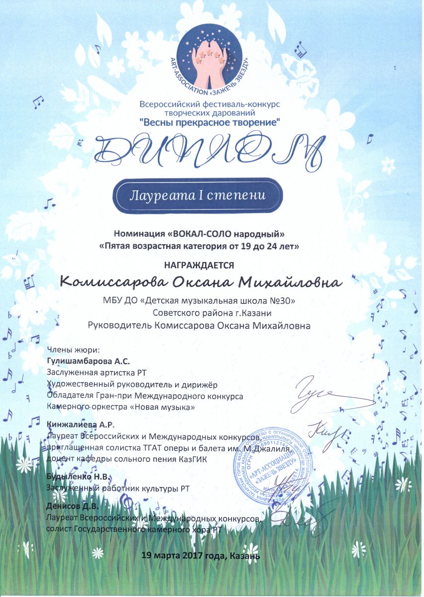 Всероссийский фестиваль-конкурс творческих дарований "Весны прекрасное творенье" - Комиссарова О.М. - I место