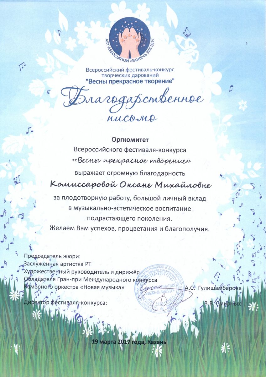 Всероссийский фестиваль-конкурс творческих дарований  "Весны прекрасное творенье" - Комиссарова О.М. - благодарственное письмо за плодотворную работу, большой личный вклад в музыкально-эстетическое воспитание подрастающего поколения