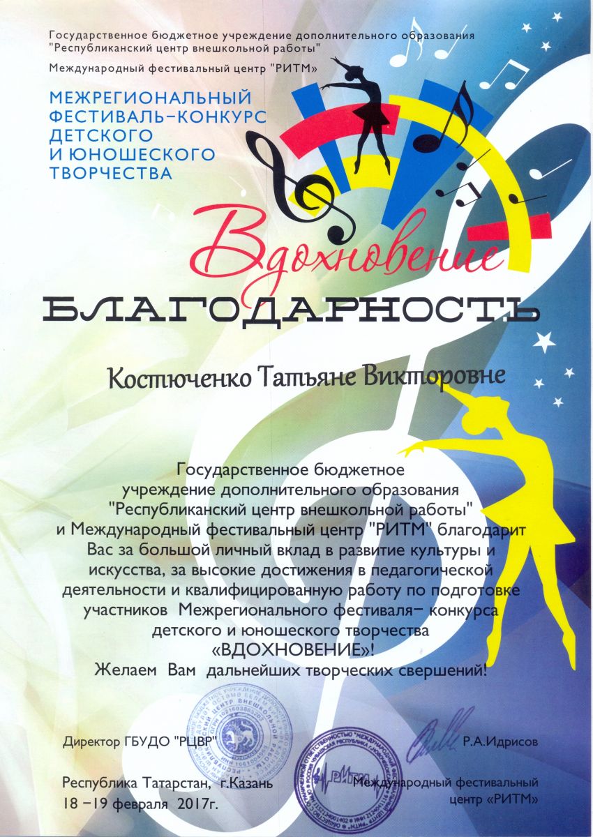Межрегиональный фестиваль-конкурс детского и юношеского творчества "Вдохновение" - Костюченко Т.В. - благодарственное письмо за высокие достижения в педагогической деятельности