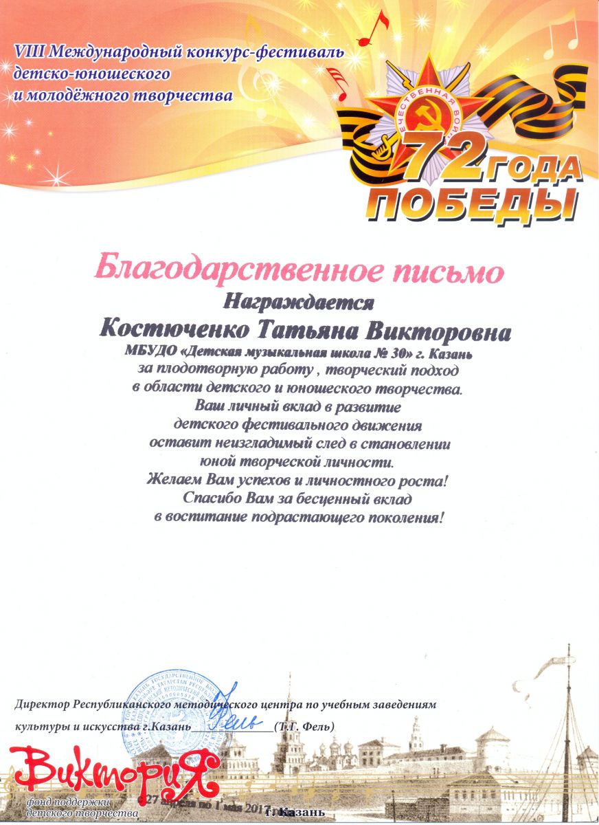VIII  Международный конкурс-фестиваль детско-юношеского и молодёжного творчества "Виктория", посвященный 72-ой годовщине Победы ВОВ - Костюченко Т.В. - благодарственное письмо за плодотворную работу, творческий подход в области детского и юношеского творчества