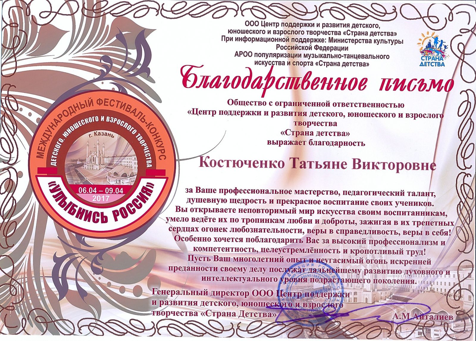 Международный фестиваль-конкурст десткого, юношеского и взрослого творчества "Улыбнись, Россия" - Костюченко Т.В. - благодарственное письмо за подготовку лауреата
