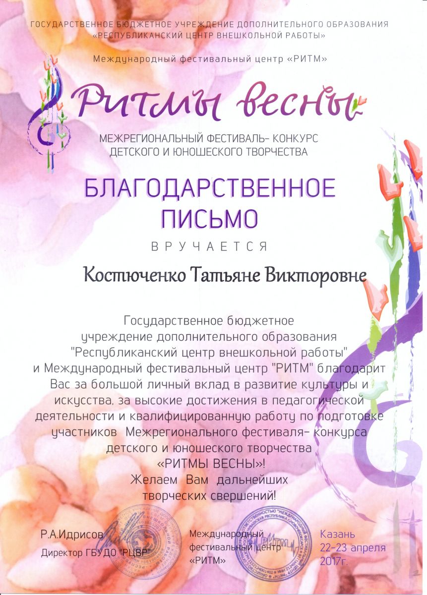 Межрегиональный фестиваль-конкурс детского и юношеского творчества "Ритмы весны" - Костюченко Т.В. - благодарственное письмо