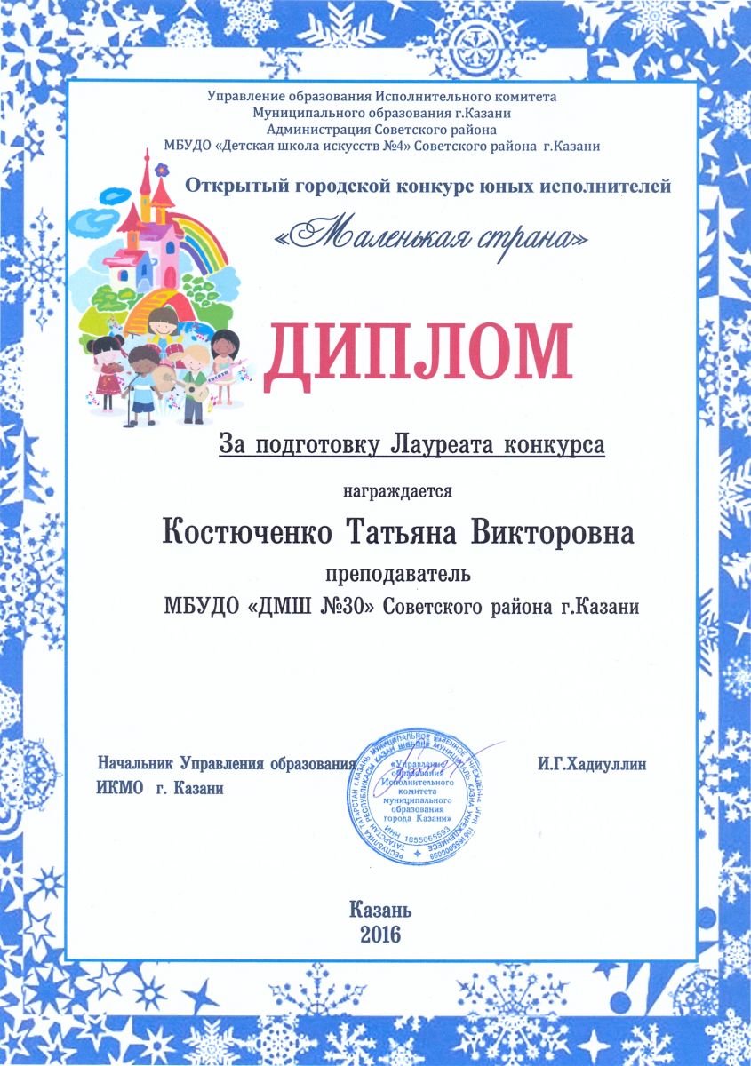 Открытый городской конкурс юных исполнителей "Маленькая страна" - Костючеснко Т.В. - диплом за подготовку Лауреата конкурса