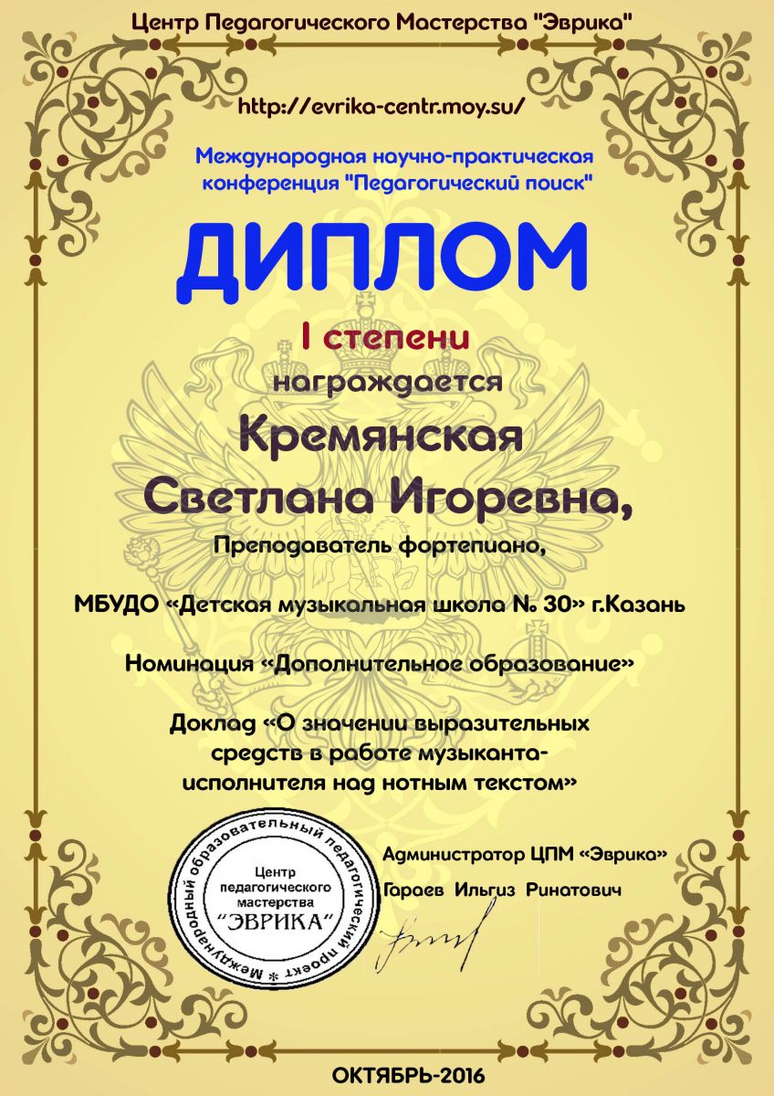Международная научно-практическая конференция "Педагогический поиск" - Кремянская С.И. - диплом I степени за доклад "О значении выразительных средств в работе музыканта-исполнителя над нотным текстом"