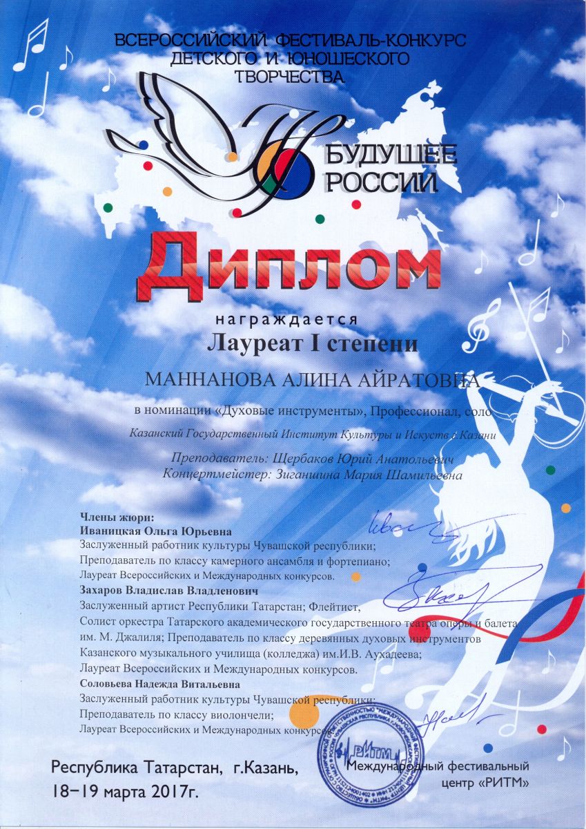 Всероссийский фестиваль-конкурс детского и юношеского творчества "Будущее России" - Маннанова А.А. - I место в номинации "Духовые инструменты", Профессионал, соло