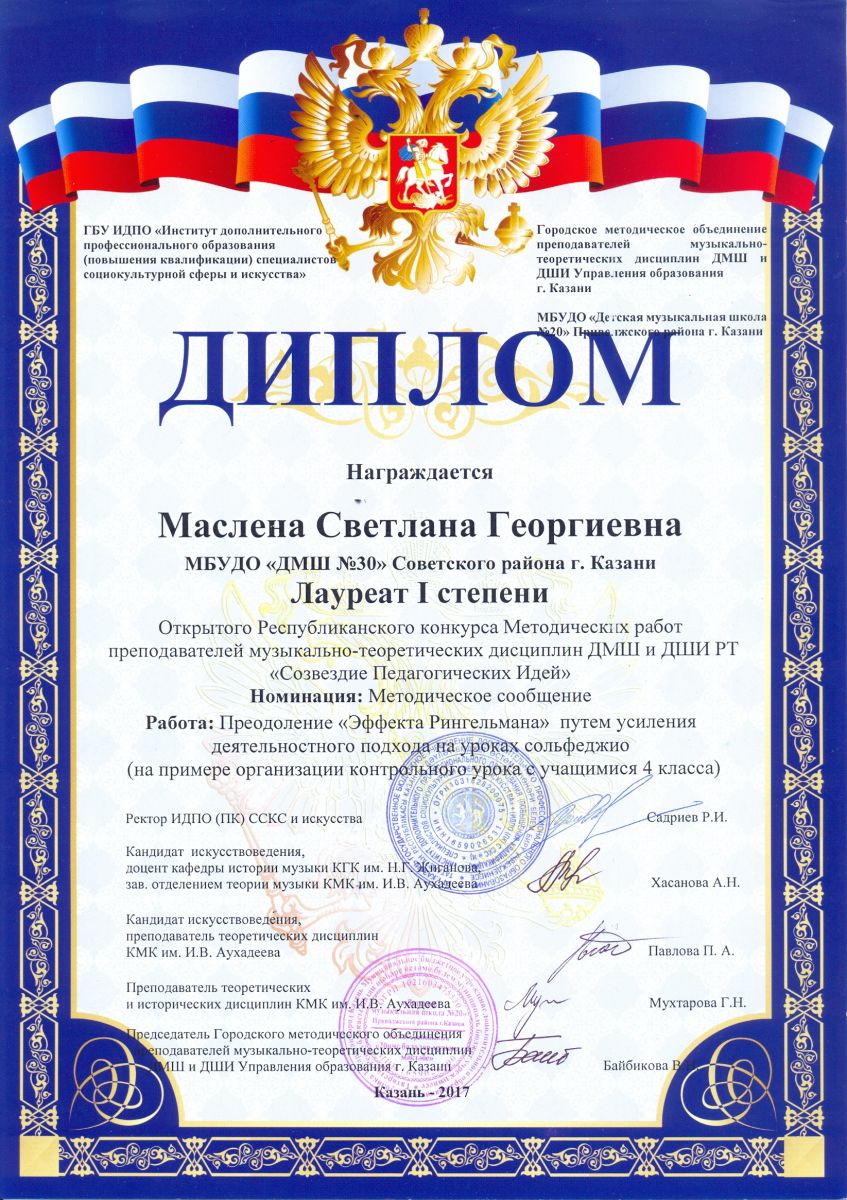 Открытый Республиканский конкурс Методических работ преподавателей музыкально-теоретических дисциплин ДМШ и ДШИ "Созвездие Педагогических Идей" - Маслена С.Г. - I место