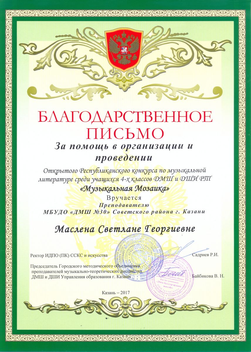 Открытый Республиканский конкурс по музыкальной литературе "Музыкальная мозаика" - Маслена С.Г. - благодарственное письмо