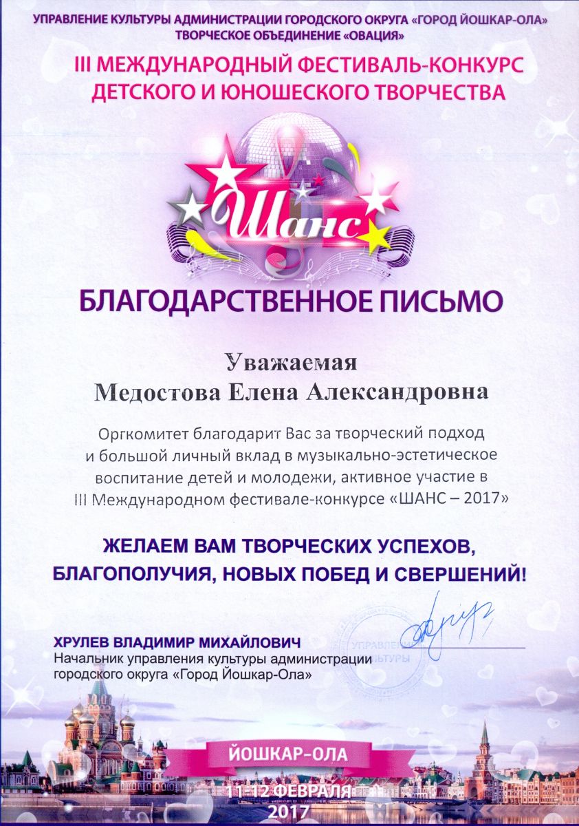 III Международный фестиваль-конкурс детского и юношеского творчества "Шанс" - Медостова Е.А. - благодарственное письмо
