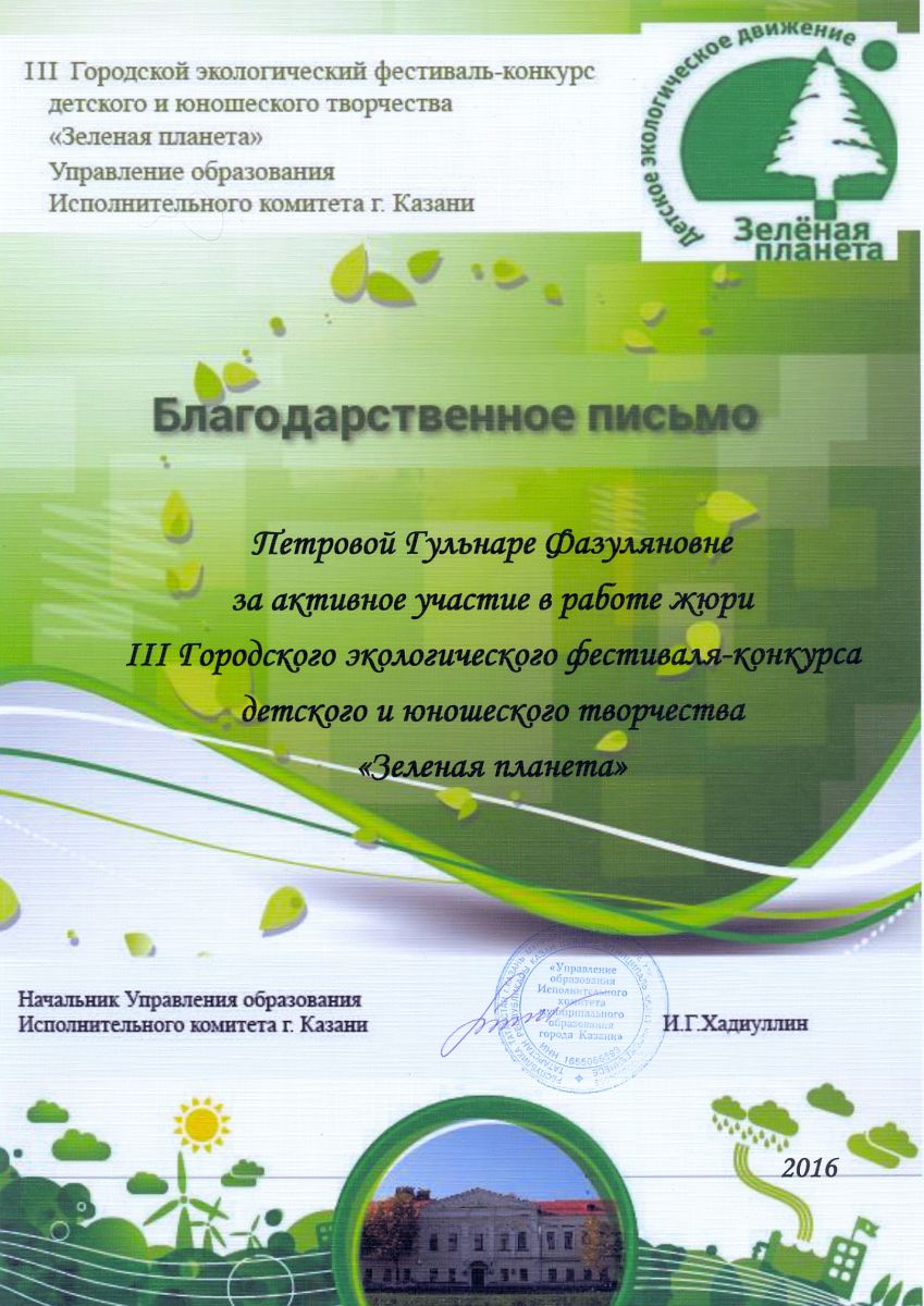 III Городской экологический фестиваль-конкурс детского и юношеского творчества "Зеленая планета" - Петрова Г.Ф. - благодарственное письмо за активное участие в работе жюри