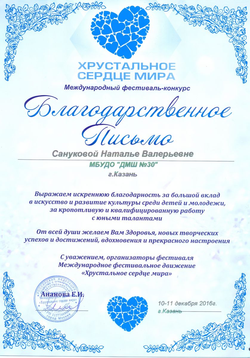 Международный фестиваль-конкурс "Хрустальное сердце мира" - Санукова Н.В. - благодарственное письмо