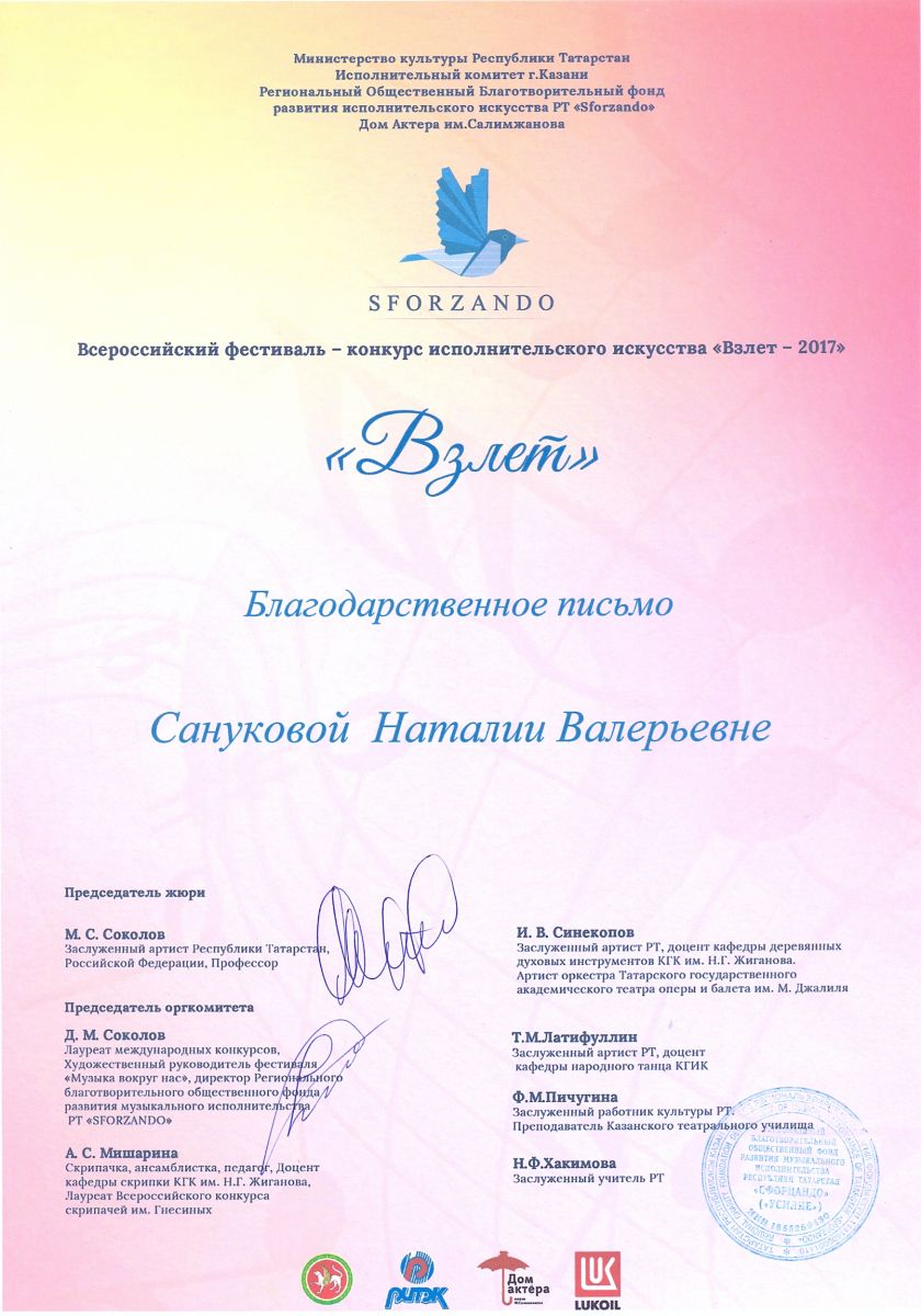 Всероссийский фестиваль-конкурс исполнительского искусства "Взлет - 2017" - Санукова Н.В. - благодарственное письмо