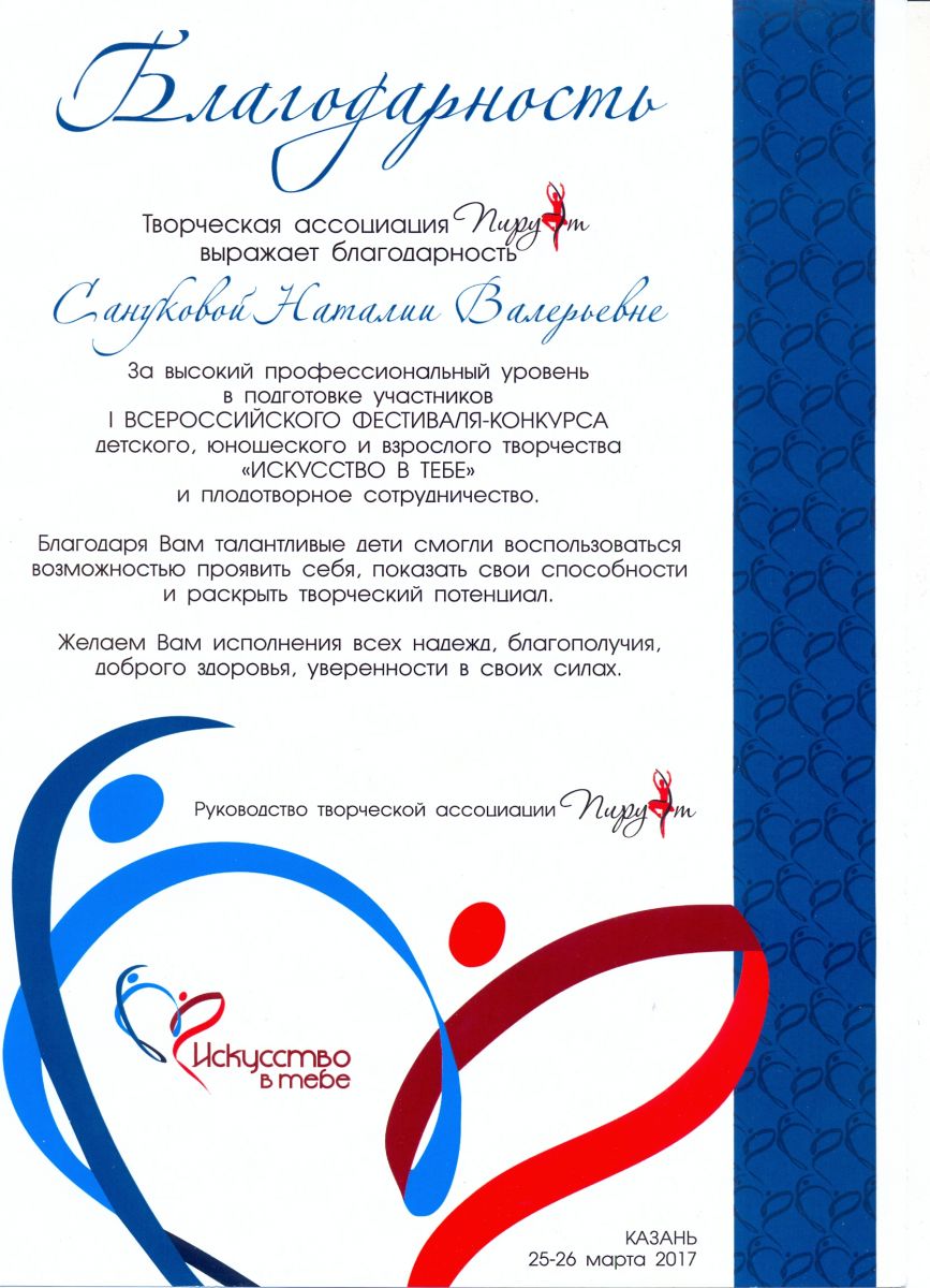 I Всероссийский фестиваль-конкурс детского, юношеского и взрослого творчества "Искусство в тебе" - Санукова Н.В. - благодарность за высокий профессиональный уровень