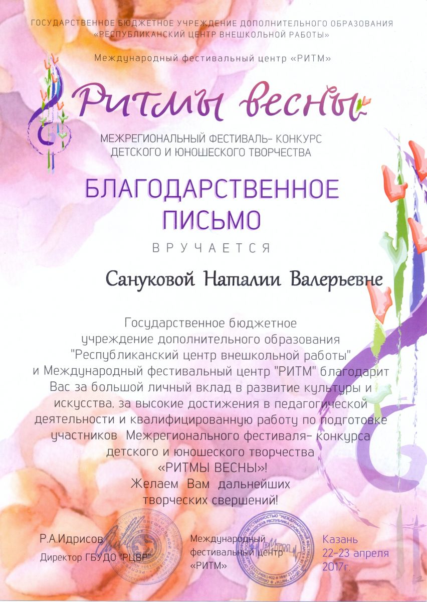 Межрегиональный фествиаль-конкурс детского и юношеского творчества "Ритмы весны" - Санукова Н.В. - благодарственное письмо
