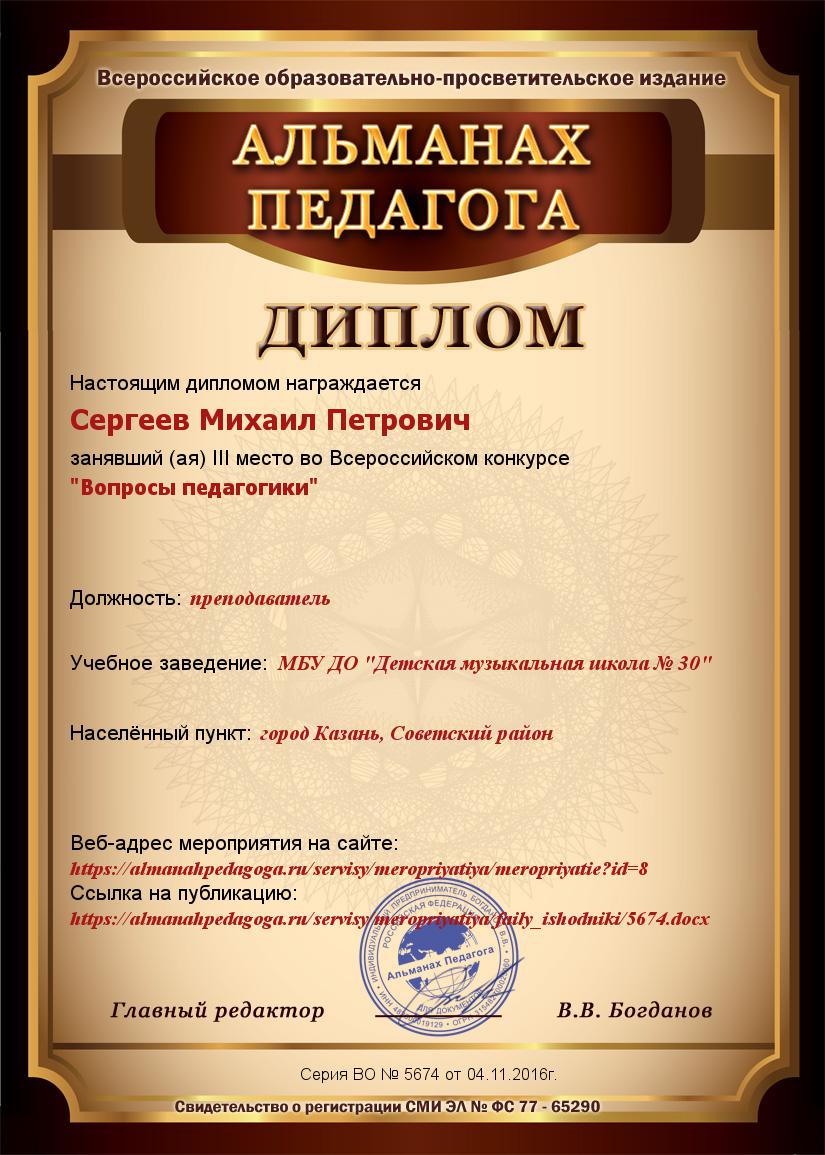 Всероссийский конкурс "Вопросы педагогики" Всероссийского образовательно-просветительского издания "Альманах педагога" - Сергеев М.П. - III место