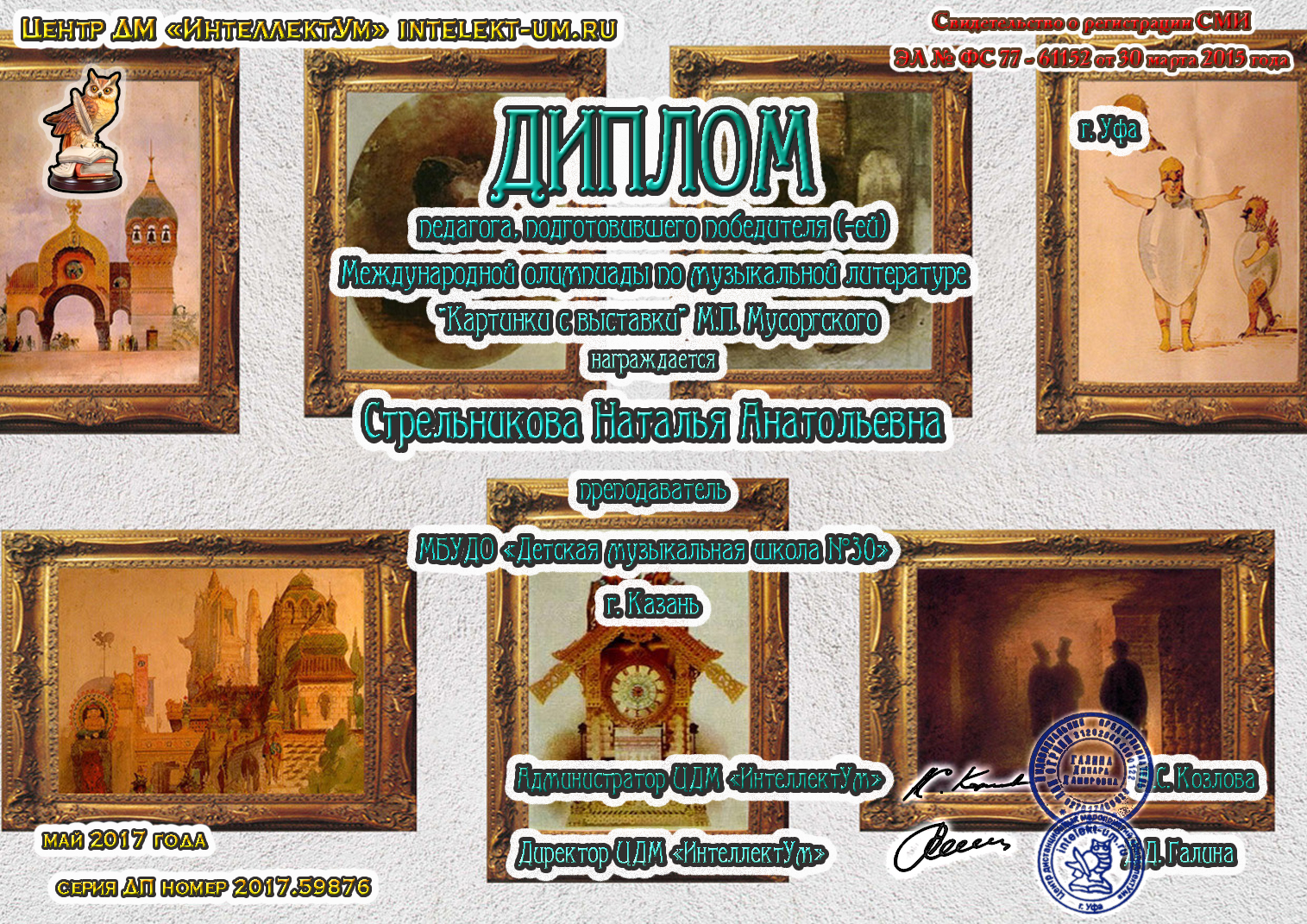 Международная дистанционная олимпиада по музыкальной литературе "Картинки с выставки М.Мусоргского" - Стрельникова Н.А. - диплом за подготовку победителя