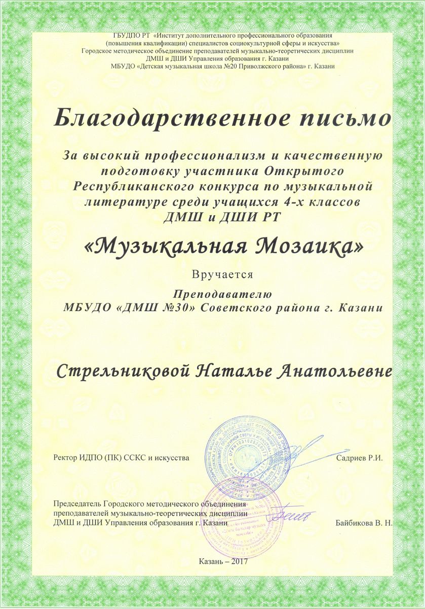 Открытый Республиканский конкурс по музыкальной литературе "Музыкальная мозаика" - Стрельникова Н.А. - благодарственное письмо за высокий профессионализм и качественную подготовку участника конкурса