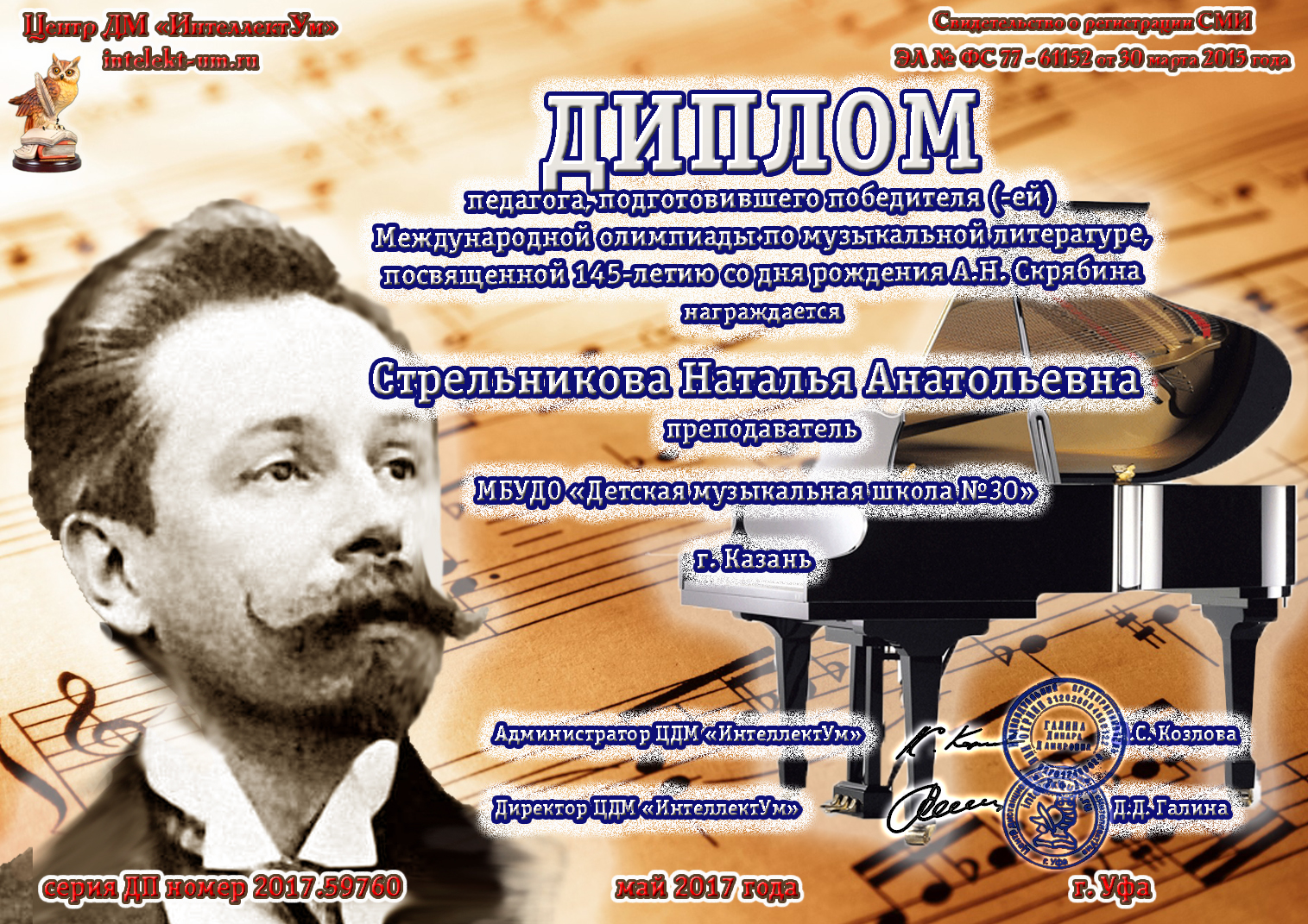 Международная дистанционная олимпиада по музыкальной литературе, посвященная 145-летию  со дня рождения А.Скрябина - Стрельникова Н.А. - диплом за подготовку победителя
