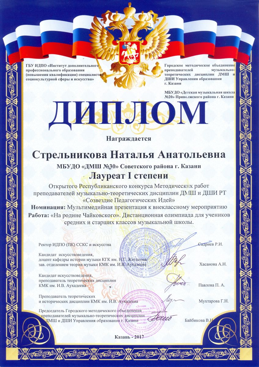 Открытый Республиканский конкурс Методических работ преподавателей музыкально-теоретических дисциплин ДМШ и ДШИ "Созвездие Педагогических Идей" - Стрельникова Н.А. - I место