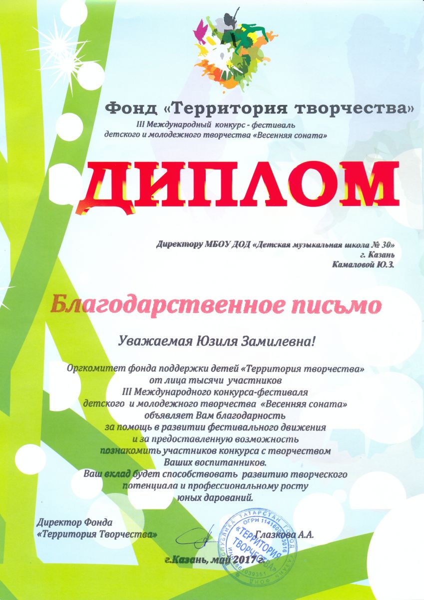 III Международный конкурс-фестиваль детского и молодежного творчества "Весеняя соната" - Камалова Ю.З. - благодарственное письмо за помощь в развитии фестивального движения
