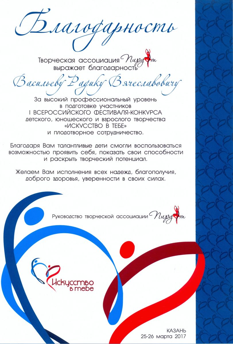 I Всероссийский фестиваль-конкурс детского, юношеского и взрослого творчества "Искусство в тебе" - Васильев Р.В. - благодарность за высокий профессиональный уровень