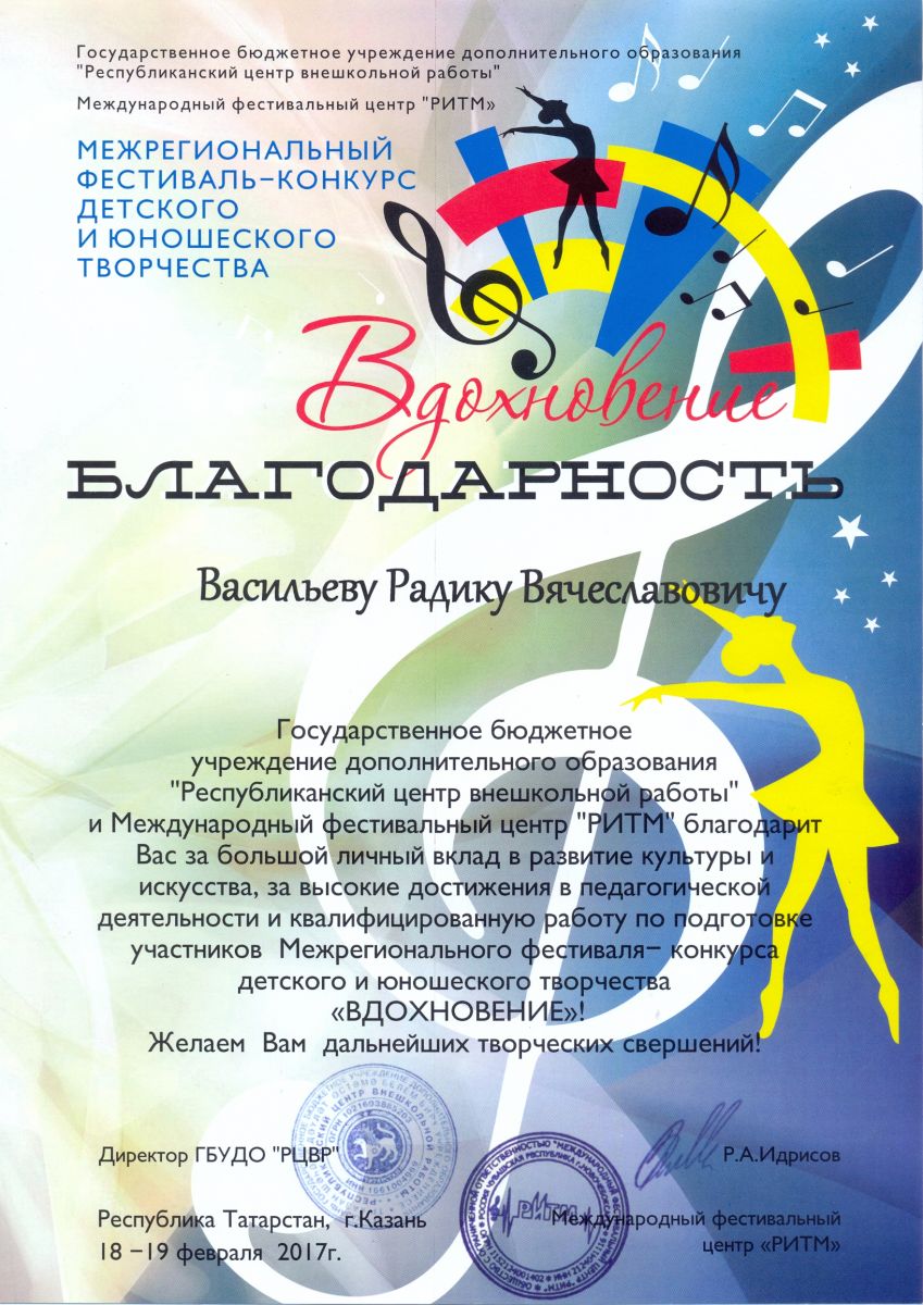 Межрегиональный фестиваль-конкурс детского и юношеского творчества "Вдохновение" - Васильев Р.В. - благодарственное письмо за высокие достижения в педагогической деятельности