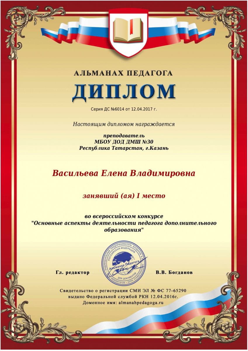 Всероссийский дистанционный конкурс "Альманах педагога" ("Основные аспекты деятельности педагога дополнительного образования") - Васильева Е.В. - I место