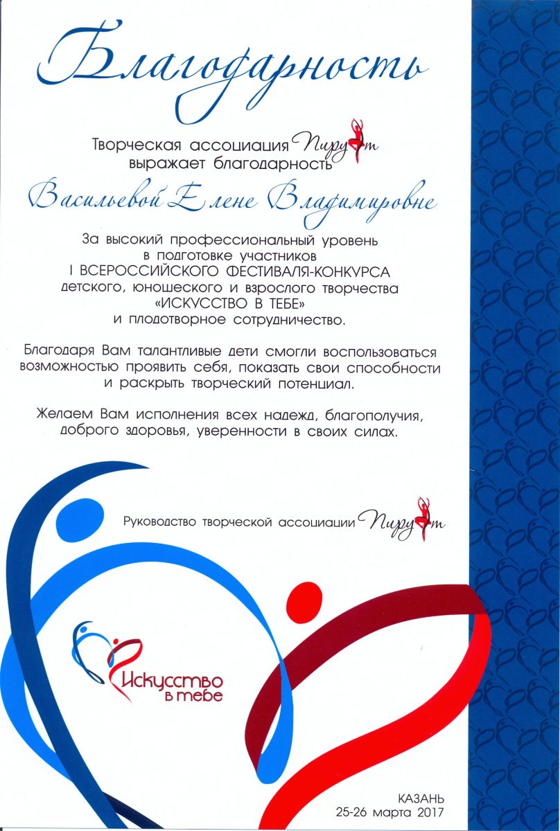 I Всероссийский фестиваль-конкурс детского, юношеского и взрослого творчества "Искусство в тебе" - Васильева Е.В. - благодарность за высокий профессиональный уровень
