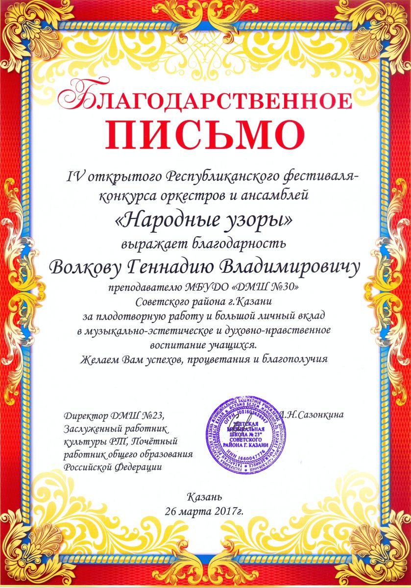 IV Открытый Республиканский фестиваль-конкурс оркестров и ансамблей "Народные узоры" - Волков Г.В. - благодарственное письмо за личный вклад в воспитание учащихся