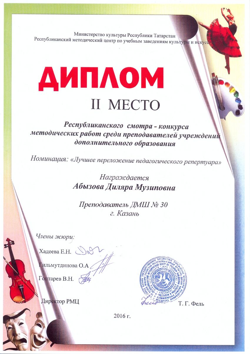 Республиканский смотр-конкурс методических работ преподавателей дополнительного образования - Абызова Д.М. - II место в номинации "Лучшее переложение педагогического репертуара"
