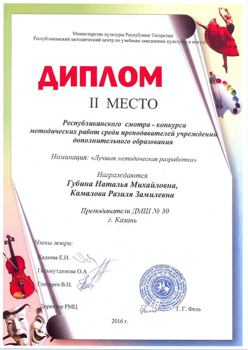 Республиканский смотр-конкурс методических работ преподавателей дополнительного образования - Камалова Р.З. - II место в номинации "Лучшая методическая разработка"