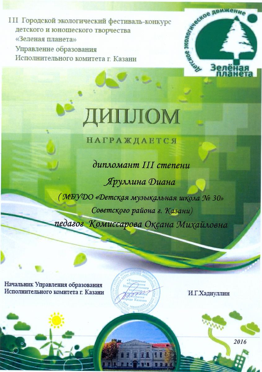 III Городской экологический фестиваль-конкурс детского и юношеского творчества "Зелёная планета" - Яруллина Диана - диплом III степени