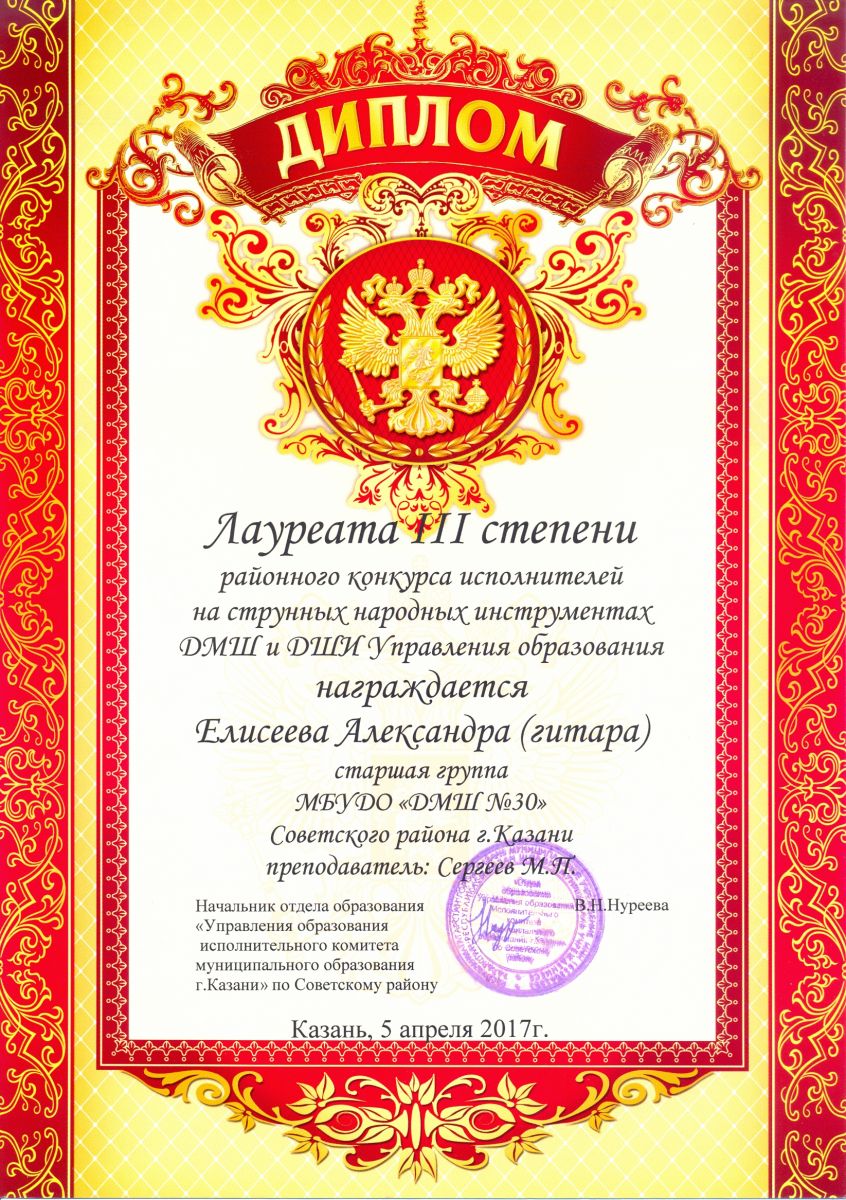 Районный конкурс исполнителей на струнных народных инструментах ДМШ и ДШИ Управления образования - Елисеева Александра - III место