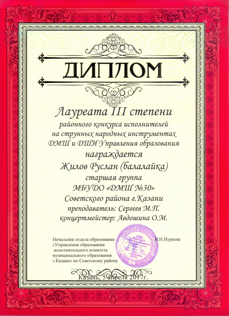 Районный конкурс исполнителей на струнных народных инструментах ДМШ и ДШИ Управления образования - Жилов Руслан - III место